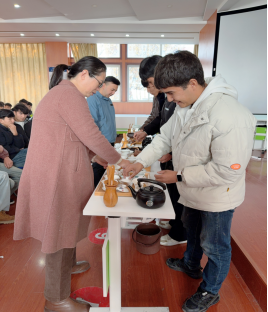 课堂上,李影书记以生动讲解与实物展示相结合的方式,系统介绍了中国茶文化的悠久历史、发展脉络、不同茶类的特色以及茶道中蕴含的“清、敬、和、美”精神内涵。从不同茶类的特点到日常生活中的待客礼仪,从一片树叶的蜕变到一盏清茶的韵味,同学们跟随讲述,沉浸于中华传统文化的博大精深之中。